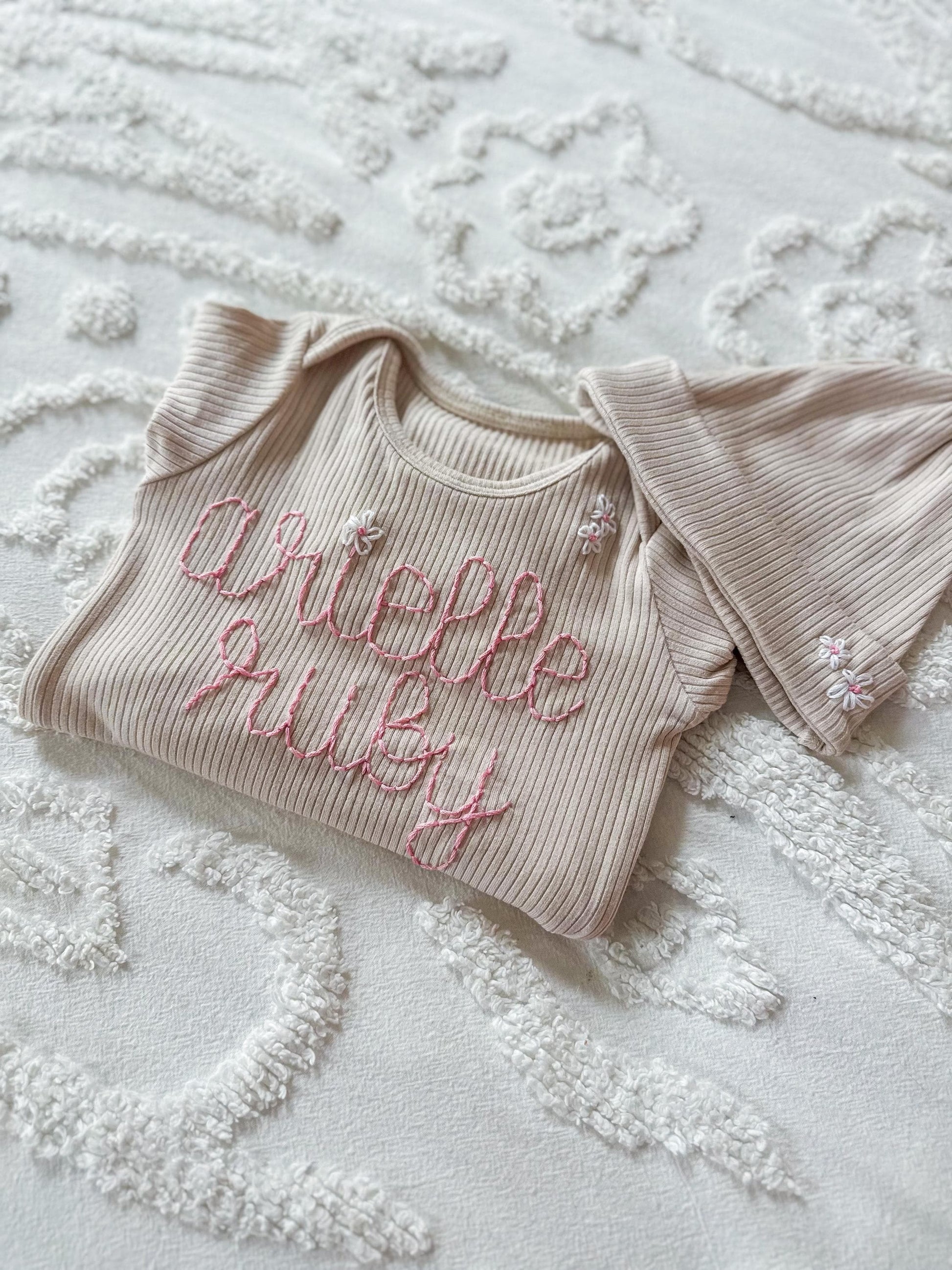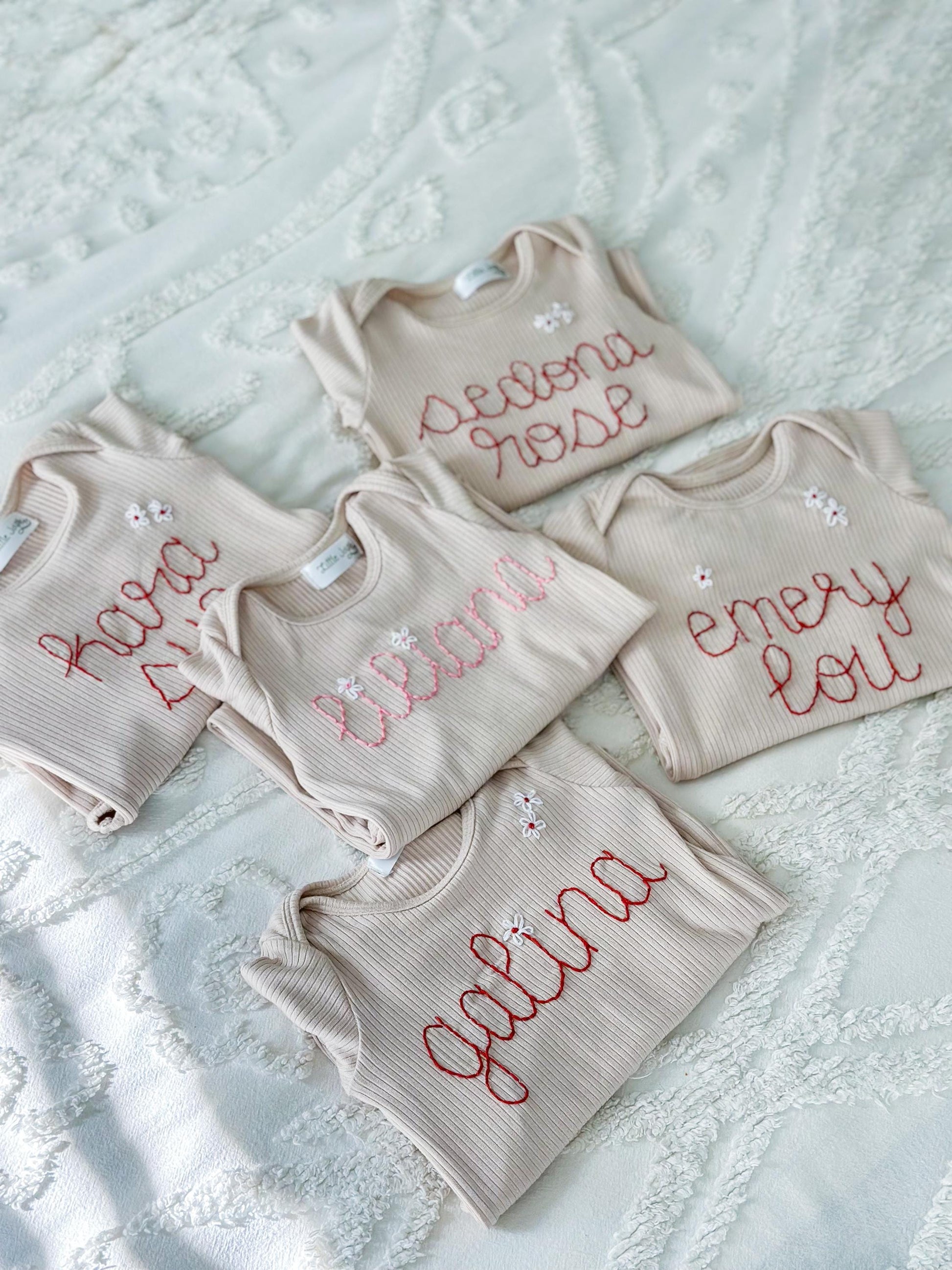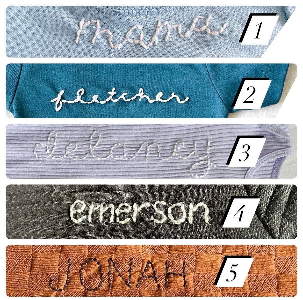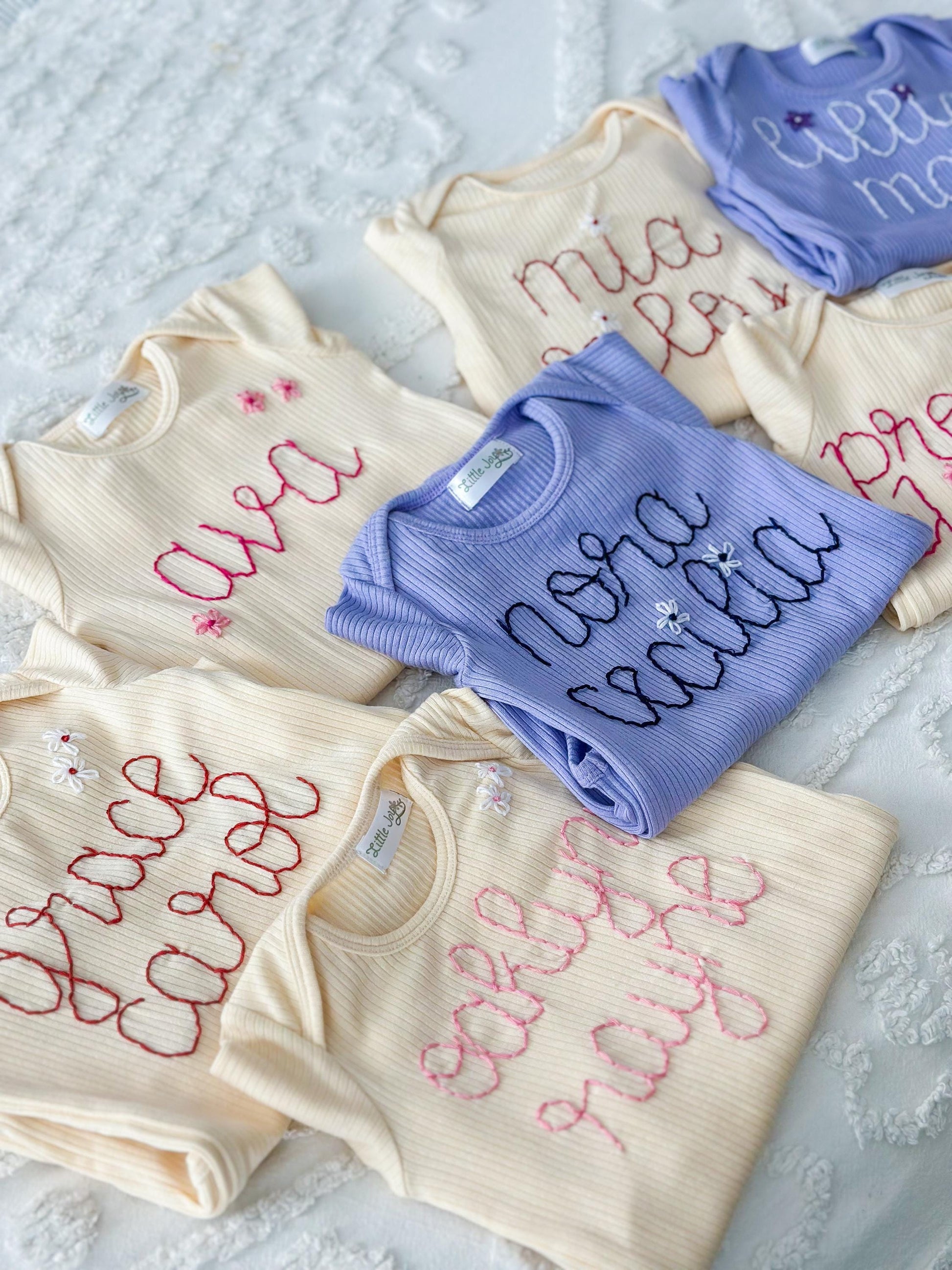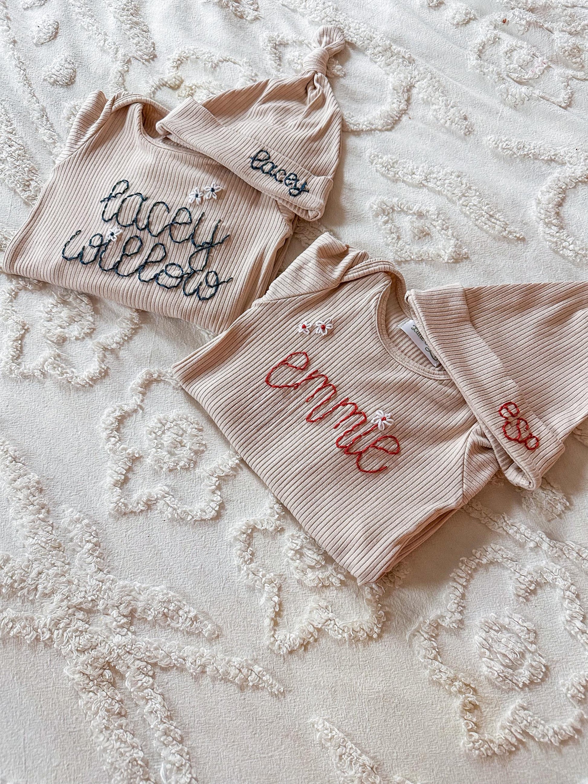 Baby ribbed knotted gowns, hand-embroidered with name or initials. One size 0-3 months. Hat and knotted gown included in the set, hat will be embroidered on left side off-centered unless otherwise specified. Perfect coming home or announcement outfit. Pick to have both hat and knotted gown embroidered or just one of the two. *please note* fonts are my own handwriting so some natural variation in lettering can be expected although I try to be as consistent as possible! See photos for colors and name placement. I offer more thread colors than those listed so if you don’t see what you want in the last picture you can message me with requests and I’ll match it as best I can.