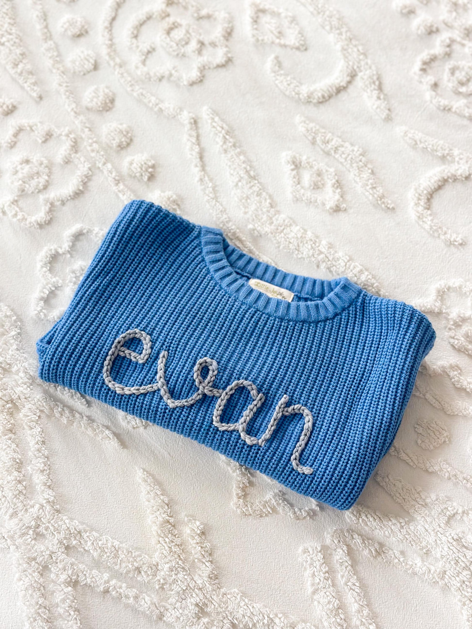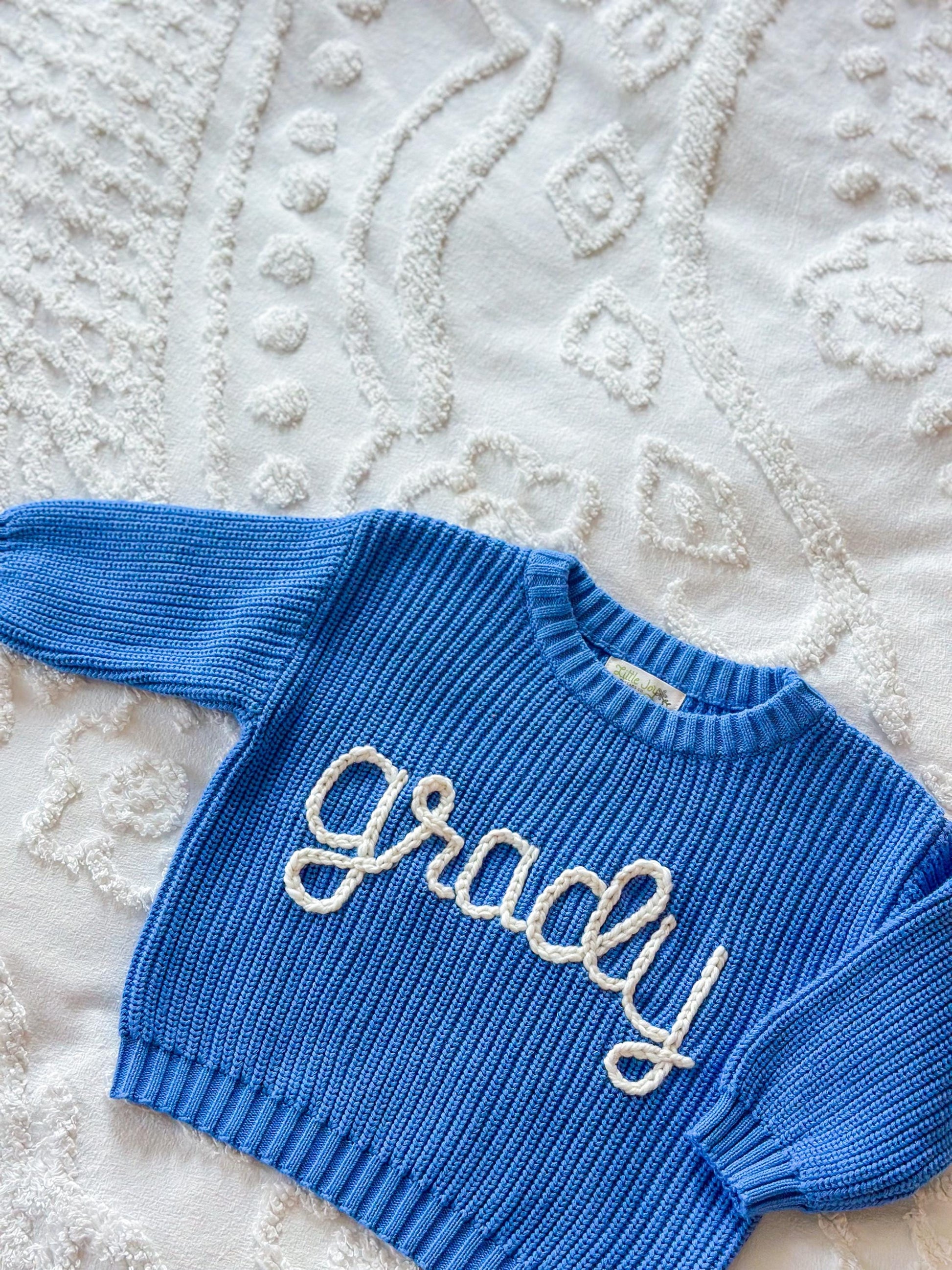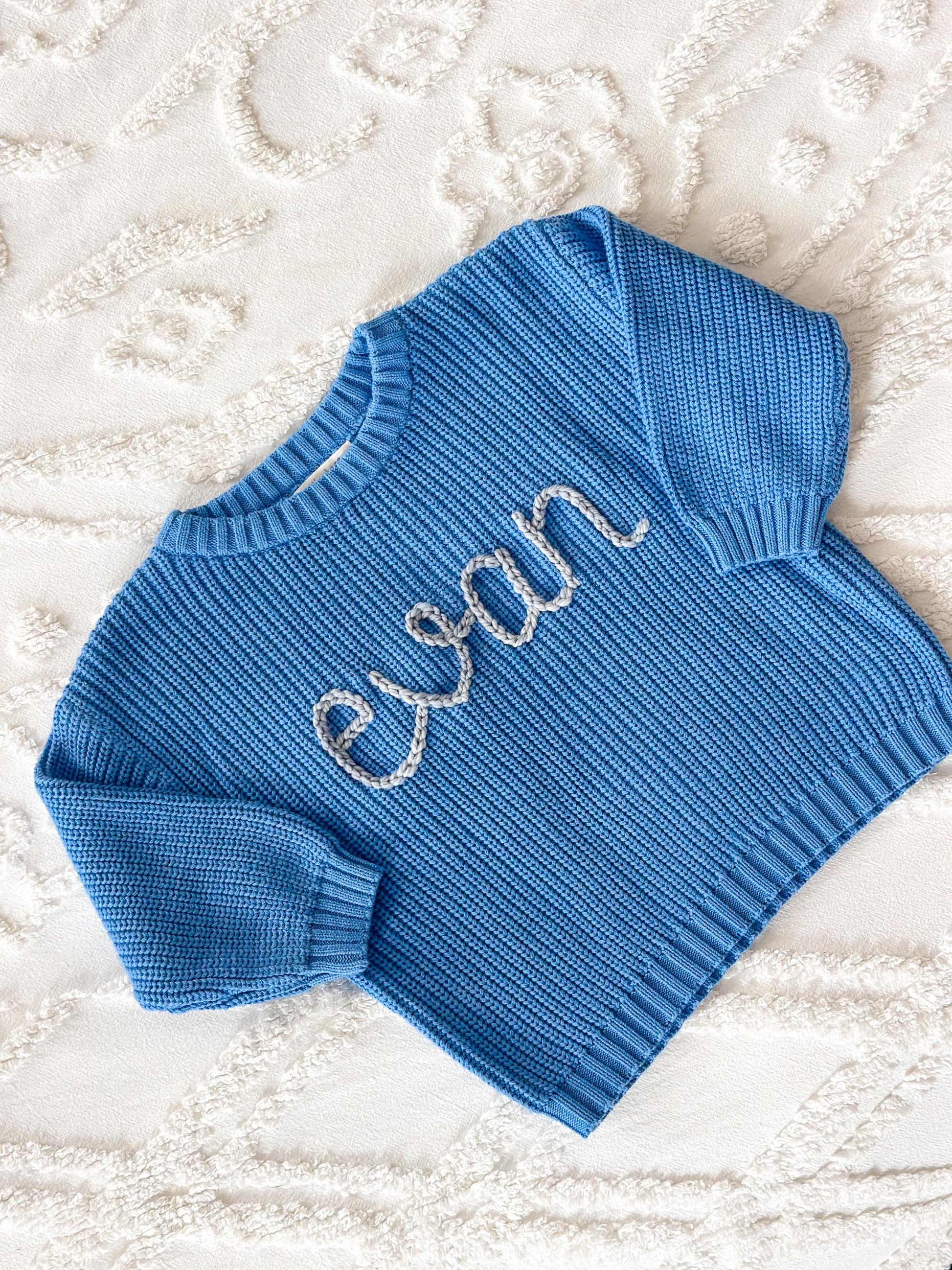Cobalt blue personalized embroidered sweater, baby and kid chunky knit