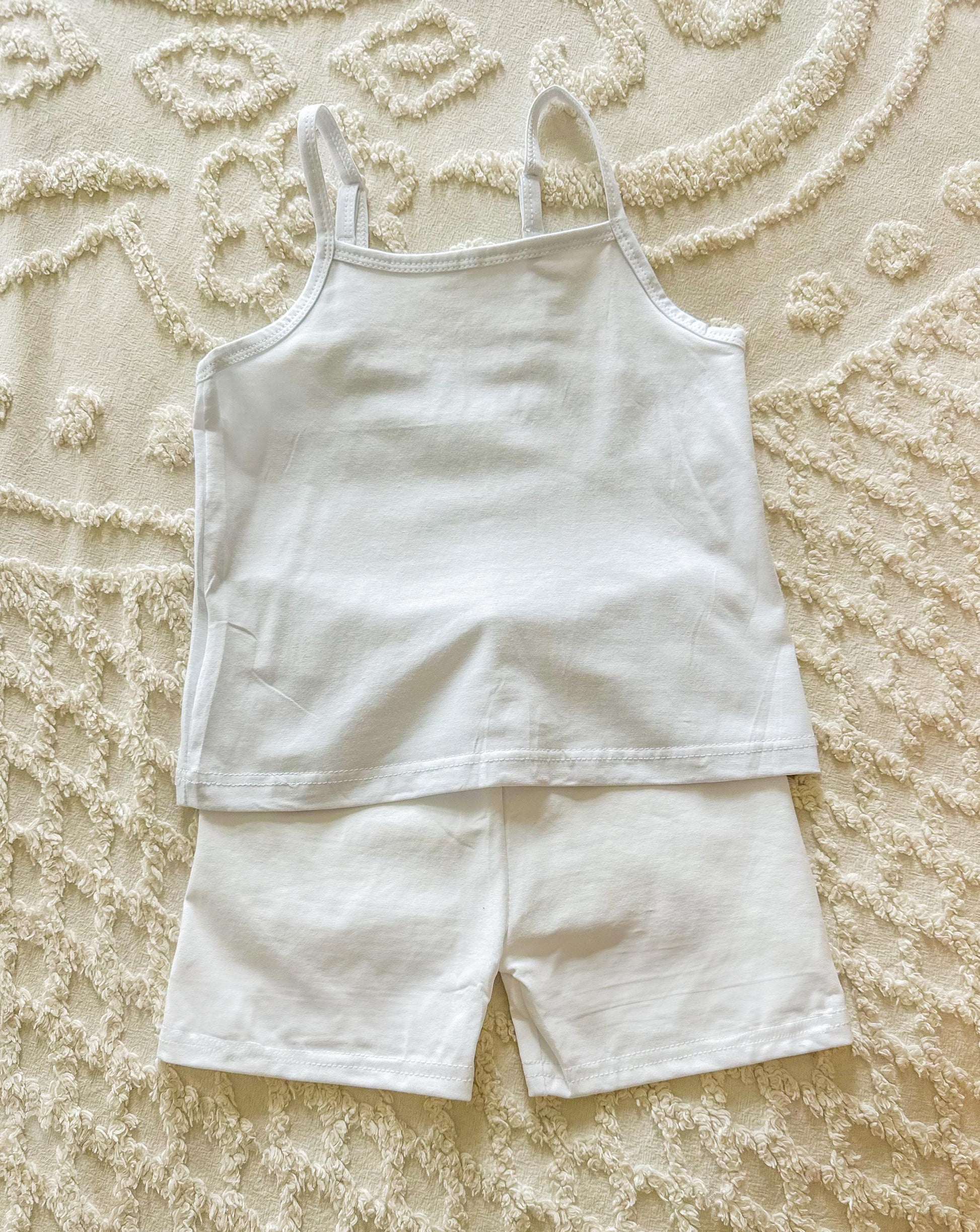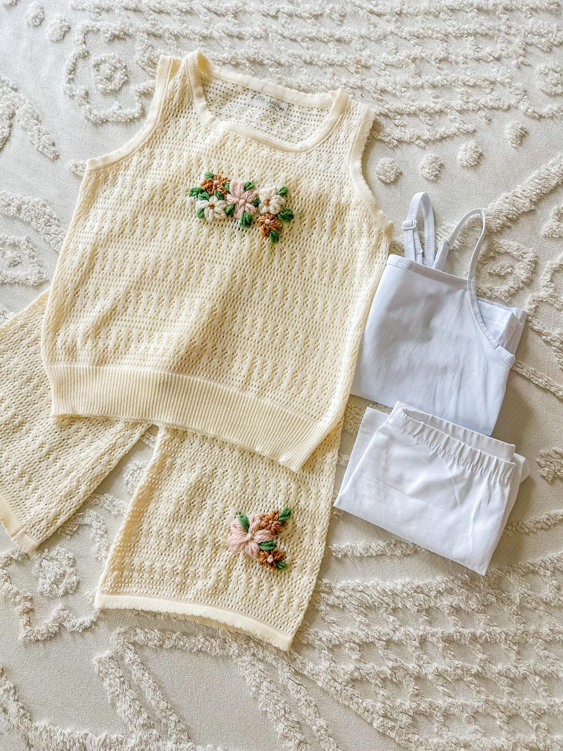 Customizable knit girls summer set with options of two design placements and yarn color customization. The cutest lightweight set for summer and heat. Detailed with hand-embroidery. Personalized with your choice of colors and chosen. Sizes 2Y to 10Y. Options to include white undergarments - cami and biker shorts are also included.