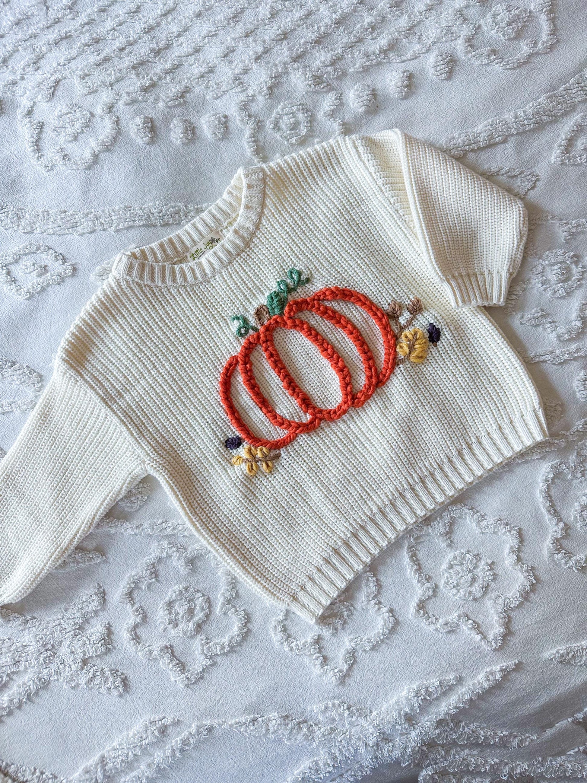 Pumpkin sweater perfect for the upcoming fall and holiday seasons. Florals on pumpkin can be custom with different colors if you would like to trade out. Pumpkin can also be embroidered in white. please specify any changes in the personalization box. Sweaters offered in sizes 0-3 months - 5Y