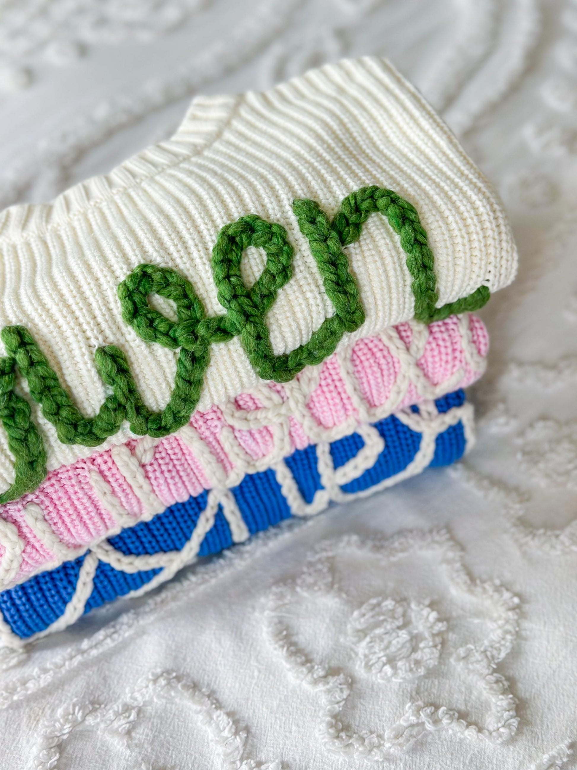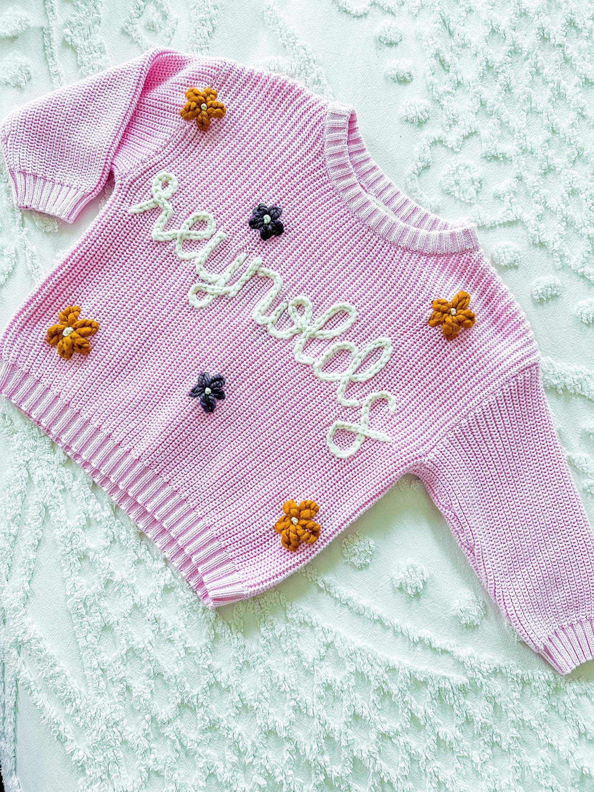 Personalized chunky knit sweater for babies, toddlers, and children. This listing is for the Peony pink sweater. All sweaters are hand embroidered. Sweaters are perfect for birthdays, birth announcements, gifts, and holiday photos. The sweater can be customized with a name and designs added with all yarn colors selected by you. If you would like flowers or any other small design added please add the design add on listing to your cart. If you would like a larger design DM me to work on customization!