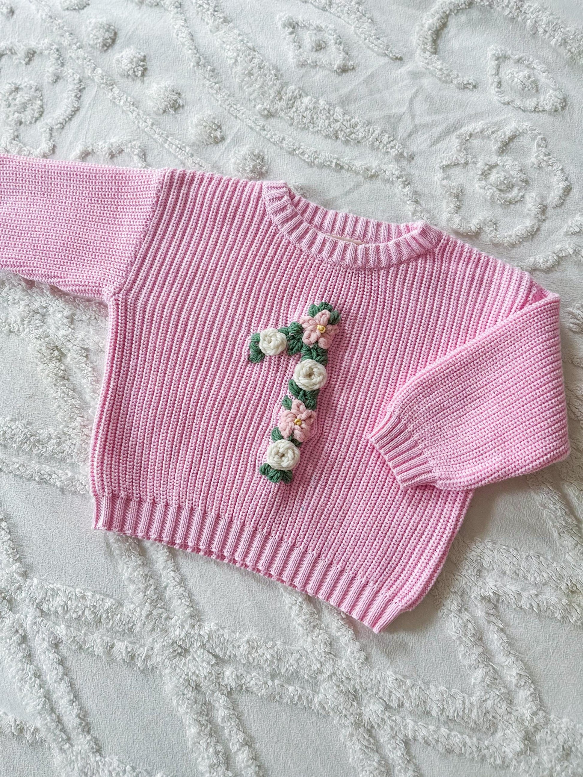 Personalized floral birthday number sweater, floral number sweater, baby and toddler chunky knit, customizable sweater