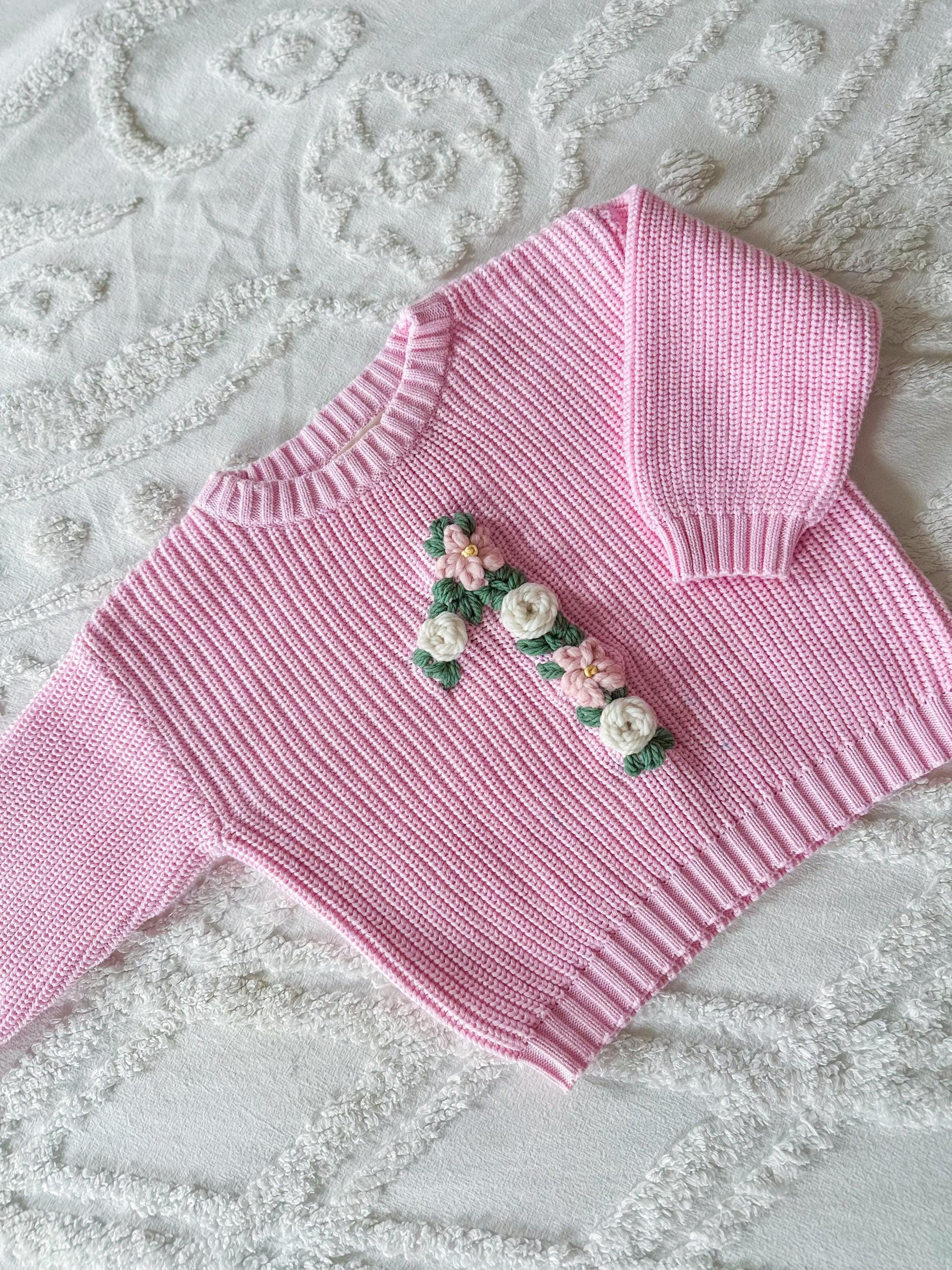 Personalized initial floral chunky knit sweater for babies, toddlers, and children. This listing is for the Pearl, Peony, or Cobalt colored sweaters. All sweaters are hand embroidered. Sweaters are perfect for birthdays, birth announcements, gifts, and holiday photos. The sweater can be customized with numbers for birthdays or other events and all yarn colors selected by you. See the listing for initial floral letters for more color inspiration ideas. If you would like an additional small design added (like bees)🐝 please add listing for design add on to your cart. If you would like a larger or multiple initial design DM me to work on customization!